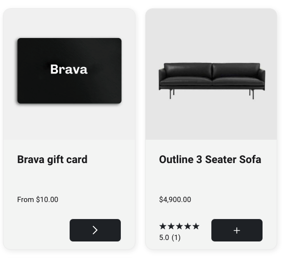 Example - Brava gift card: This product has multiple variants, so the product button will show an arrow to view product details.